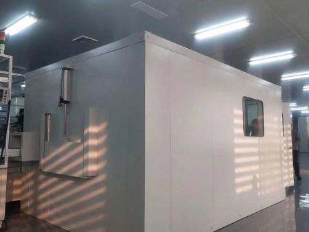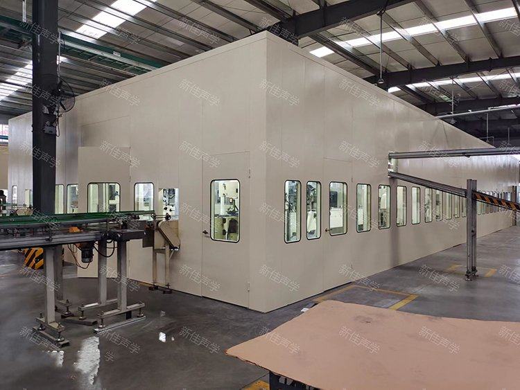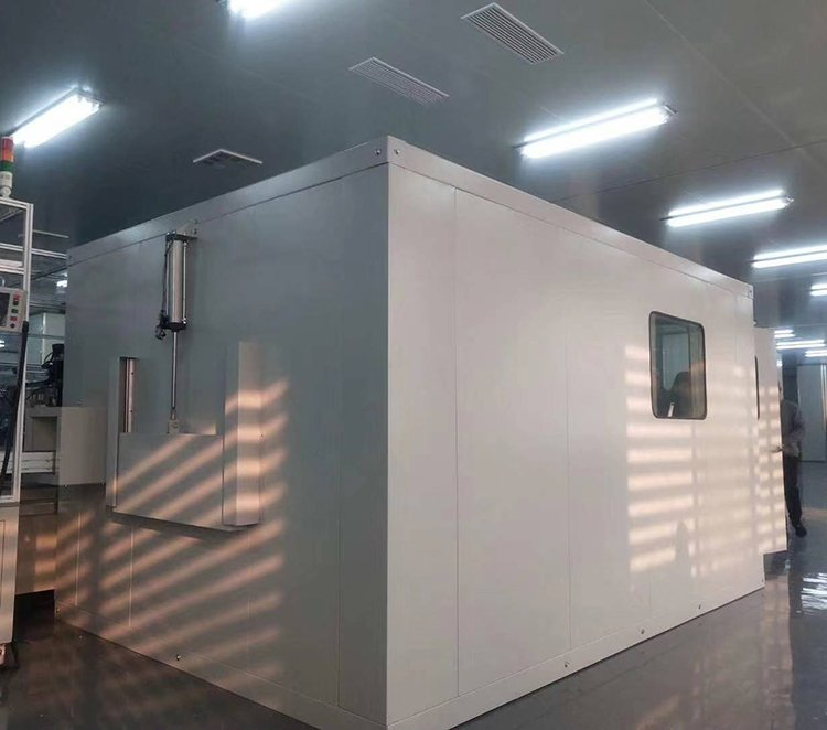 工件通过流水线进入隔声房进行测试,隔音房将噪声源封闭在一个小空间内,以减小它对外辐射噪声的一种围护结构。因此,可根据各噪声源设备的具体使用要求、设备运行工况、通风散热需求进行设计。隔声房插入损失:20-40dB(A),隔声要求可根据用户要求进行设计。